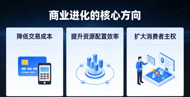 但如果我们拉长时间维度,站在商业发展的宏观视角回望,就会发现一条清晰的脉络:商业进化的方向,从来都是围绕降低交易成本、提升资源配置效率、扩大消费者主权这三大核心展开。从原始社会的物物交换到一般等价物的出现,再到货币的诞生,让交易变得更便捷、成本更低;从线下实体商店的遍地开花,到电子商务的全民普及,再到如今文创电商、兴趣电商等新模式的百花齐放,让资源配置更精准,让消费者有了更多的选择、更大的消费自主权。